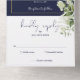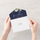 Le tout en une faire-part de mariage reportée avec des feuilles botaniques et rustiques tombant sur une arche d'or renfermant une élégante typographie sur un arrière - plan bleu marine. L'invitation comprend une carte RSVP perforée qui peut être adressée individuellement ou laissée vide pour que vous puissiez écrire à la main les coordonnées de votre invité. Conçu par Thisisnotme©