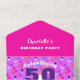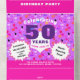 Invitation à la fête d'anniversaire du 50e anniversaire moderne dans des tons colorés, dont le rose chaud et le violet et avec un motif inspiré du terrazzo. Si dynamique et facile à customiser avec vos données personnelles sans frais supplémentaires. De plus, il a inclus une déchirure pratique de la carte RSVP pour votre commodité.