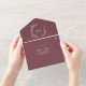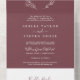 Ce mariage bordeaux minime aux feuilles, tout en une seule invitation, est parfait pour un mariage de saumons. Le design bohème présente une silhouette de verdure simple dans une couleur de vin rouge foncé avec un style boho minimaliste classique. Écrivez vos adresses d'invités à l'arrière de l'invitation pliée, ou achetez les autocollants de étiquette de adresse d'invités de coordination (vendus séparément).