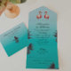 Un décor tropical et lumineux sur le thème de la plage inspiré d'une île aux eaux claires. Élégant script avec polices sans serif. Les couleurs arrière - plans sont bleu ciel et les teintes aqua avec flamants roses/coraux et palmiers. Ce design moderne et gai est idéal pour les mariages de plage, de port de plaisance et de destination. Les polices sont personnalisables.
