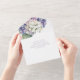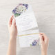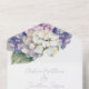 Cette invitation de mariage floral romantique présente des hortensias violets et blancs à l'aquarelle. Un délicat bouquet de fleurs d'hortensia est représenté sur le devant, et deux à l'intérieur.