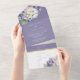 Ce faire-part de mariage fleuri romantique présente des hydrangées violettes et blanches aquarelles sur un arrière - plan de couleur lavande violette poussiéreuse. Un délicat bouquet de fleurs d'hydrangée est représenté à l'avant, et deux à l'intérieur.