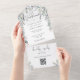 Faire-part de mariage tout-en-un avec verdure fleurie et typographie élégante. L'invitation comprend une carte RSVP perforée qui contient le code QR de votre site Web mariage. Conçu par Thisisnotme©