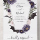 Halloween 31 Octobre Automne Couleur d'eau foncée violet et vert de mariage Invitations sur arrière - plan noir - comprend hantante et effrayante typographie de script élégant avec des fleurs modernes et des ailes chauves-souris pour la célébration spéciale de mariage Déplaisant.