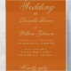 Un faire-part de mariage simple mais élégant et inhabituel avec RSVP amovible. Tout le texte est doré. L'arrière - plan est orange brûlé. Une fois plié, il ressemble à une enveloppe, avec l'adresse de retour imprimée sur le pli, et il peut être envoyé par la poste. Le RSVP détachable a sur son dos l'adresse imprimée et aussi un lieu pour le timbre, de sorte qu'il peut être envoyé par la poste comme carte postale. Certains mots sont écrits dans un élégant script calligraphique : le mot Mariage, les noms de la mariée et du marié et les mots "Kindly response" dans la RSVP. Le reste est écrit en casquette.
