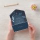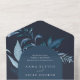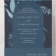 Notre faire-part de mariage Winter Azure entoure vos détails de jour de mariage avec une arche de feuillage aquarelle dynamique. Un choix moderne mais organique pour les mariages d'hiver ou de printemps avec des éléments botaniques peints de manière complexe. Colorway : Winter Azure, un mélange de bleus gelés sur un arrière - plan sombre.