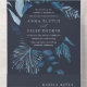 Notre faire-part de mariage Wild Azure entoure vos détails de jour de mariage avec un cadre géométrique de feuillage d'aquarelle vibrante. Un choix moderne mais organique pour les mariages d'hiver ou de printemps avec des éléments botaniques peints de manière complexe. Colorway : Azur sauvage, un mélange de bleus gelés sur un arrière - plan bleu marine.