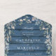 Une faire-part de mariage tout-en-un présente une belle cascade de verdure fleurie, une typographie élégante et des initiales monographiques sur un arrière - plan de panneaux de bois de grange bleu rustique. L'invitation comprend une carte RSVP perforée avec votre code QR du site Web mariage et des détails. Conçu par Thisisnotme©