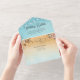 Le tout dans une destination plage mariage triple invitation avec un arrière - plan rustique ombre jaune à aquarelle bleu, étoiles de mer, coquillages, lumières à cordes, deux coeurs dans le sable avec vos initiales, détails mariage, invitation de mariage, et un menu rsvp carte postale pour vos invités à déchirer et renvoyer.