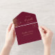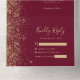 Le bord gauche de cette élégante faire-part de mariage tout-en-un moderne et RSVP est orné d'une bordure de parties scintillant en faux or. Le texte personnalisable combine écriture fantaisie dorée, copperplate et polices italiques sur un arrière - plan rouge bordeaux. L'adresse de retour apparaît sur le rabat extérieur et sur le côté arrière de la carte RSVP détachable en texte doré sur un bordeaux solide.