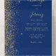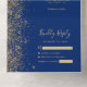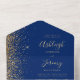 Le bord gauche de cette élégante faire-part de mariage tout-en-un moderne et RSVP est orné d'une bordure de parties scintillant en faux or. Le texte personnalisable combine écriture fantaisie dorée, copperplate et polices italiques sur un arrière - plan bleu foncé. L'adresse de retour apparaît sur le rabat extérieur et sur le côté arrière de la carte RSVP détachable en texte doré sur un bleu foncé solide.