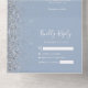 Le bord gauche de cette élégante faire-part de mariage tout-en-un moderne et RSVP présente une bordure en faux parties scintillant argentée. Le texte personnalisable combine écriture blanche fantaisie, copperplate et italique sur un arrière - plan bleu poussiéreux. L'adresse de retour s'affiche sur le rabat extérieur et sur le côté arrière de la carte RSVP détachable en texte blanc sur un bleu poussiéreux solide.