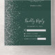 Le bord gauche de cette élégante faire-part de mariage tout-en-un moderne et RSVP présente une bordure en faux parties scintillant argentée. Le texte personnalisable combine écriture lunatique gris argenté, copperplate et polices italiques sur un arrière - plan vert émeraude. L'adresse de retour apparaît sur le rabat extérieur et sur le côté arrière de la carte RSVP détachable en gris argenté sur vert émeraude solide.
