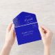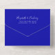 Le bord gauche de cette élégante faire-part de mariage tout-en-un moderne et RSVP présente une bordure en faux parties scintillant argentée. Le texte personnalisable combine écriture blanche fantaisie, cuivre et italique sur un arrière - plan bleu royal. L'adresse de retour apparaît sur le rabat extérieur et sur le côté arrière de la carte RSVP détachable en blanc sur bleu royal solide.