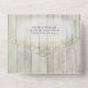 Cet invitation de mariage tout-en-un de destination de plage inclut l’invitation et la RSVP en déchirure, et peut être plié et envoyé par la poste afin que vous n’ayez pas besoin d’une enveloppe. Il dispose d'un script d'écriture moderne et branché, et la belle scène de plage avec des vagues de l'océan qui s'écrasent sur le rivage est encadrée par un arrière - plan de bois gris patiné rustique. Des lumières à cordes décorent le dessus.