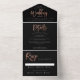 Un faire-part de mariage tout-en-un moderne avec une grande calligraphie métallique en or rose et une carte de réponse déchirante.