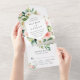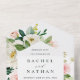 Ce tout en une carte de faire-part de mariage présente une forme hexagonale entourée de fleurs d'aquarelle peintes dans un feuillage rose vif, blanc et vert, une invitation de mariage avec une carte postale rsvp à couper et renvoyer à vos invités. Pour une personnalisation plus avancée de cette conception, cliquez sur le lien "customiser plus loin". Des articles correspondants sont également disponibles.