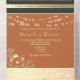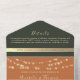 Elégant, moderne, or, vert émeraude et orange brûlé terre cuite mariage tout-en-un invitation avec dentelle dorée fleurie, lumières à cordes et photo personnalisée du couple à l'arrière. Ajoutez votre photo, les détails du mariage et rsvp.