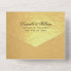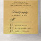Un élégant et inhabituel faire-part de mariage noir et or avec RSVP amovible. Une fois plié, il ressemble à une enveloppe, avec l'adresse de retour imprimée sur le pli, et il peut être envoyé par la poste. Le RSVP détachable a sur son dos l'adresse imprimée et aussi un lieu pour le timbre, de sorte qu'il peut être envoyé par la poste comme carte postale. Certains mots sont écrits dans un élégant script calligraphique : le mot Mariage, les noms de la mariée et du marié et les mots "Kindly response" dans la RSVP. Le reste est écrit en casquette. Tout le texte est noir. L'arrière - plan est un faux papier doré.