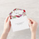 Une belle décoration florale avec bouquet floral rouge violet blanc aquarelle dans un tout en un faire-part de mariage. Vos invités peuvent déchirer la carte RSVP et la renvoyer par la poste. Tous les champs sont modifiables.