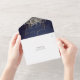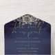 Le tout dans un faire-part de mariage gothique avec des fleurs roses noires et or tombant sur une élégante typographie sur un arrière - plan bleu nuit. L'invitation comprend une carte RSVP perforée qui peut être adressée individuellement ou laissée vide pour que vous puissiez écrire à la main les coordonnées de votre invité. Conçu par Thisisnotme©