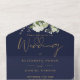 Le tout dans un faire-part de mariage de verdure botanique, de feuilles rustiques et d'élégante typographie or sur un arrière - plan bleu marine. L'invitation comprend une carte RSVP perforée qui peut être adressée individuellement ou laissée vide pour que vous puissiez écrire à la main les coordonnées de votre invité. Conçu par Thisisnotme©
