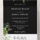 Ce tout-en-un faire-part de mariage noir et blanc présente une végétation botanique tombant sur une typographie élégante. L'invitation comprend une carte RSVP perforée qui peut être adressée individuellement ou laissée vide afin que vous puissiez écrire à la main les coordonnées de votre invité. Conçu par Thisisnotme©