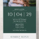 Un élégant minimaliste vert émeraude tout en un faire-part de mariage avec votre photo, date spéciale et détails mariages ensemble dans la typographie classique et chic. L'invitation comprend une carte RSVP perforée qui peut être adressée individuellement ou laissée en blanc pour que vous puissiez écrire à la main les coordonnées de votre invité. Conçu par Thisisnotme©