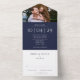 Un élégant minimaliste bleu marine tout en un faire-part de mariage avec votre photo, date spéciale et détails mariages ensemble dans la typographie classique et chic. L'invitation comprend une carte RSVP perforée qui peut être adressée individuellement ou laissée en blanc pour que vous puissiez écrire à la main les coordonnées de votre invité. Conçu par Thisisnotme©