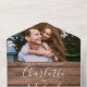 Le tout dans un faire-part de mariage photo avec de jolies lampes à cordes, des jarres de maçon, des noms de style signature et une typographie chic sur un arrière - plan rustique en bois. L'invitation comprend une carte RSVP perforée qui peut être adressée individuellement ou laissée vide pour que vous puissiez écrire à la main les coordonnées de votre invité. Conçu par Thisisnotme©