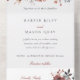Invitation vos invités dans le style avec ce tout-en-un faire-part de mariage avec une section RSVP déchirante. Le design est agrémenté d'une aquarelle fleurie, avec de riches tons marsala et des accents de rousseur, d'ivoire et de sauge. Les fleurs, magnifiquement crénelées pour apparaître comme fraîchement cueillies dans un jardin d'automne, sont en cascade dans les coins de la carte, fournissant un cadre dynamique pour les détails de l'événement. Cette carte est parfaite pour toute saison, mais surtout idéale pour les mariages d'automne et d'hiver, offrant une touche de splendeur naturelle combinée à la commodité d'une carte de réponse détachable.