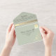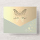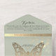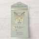Un faire-part de mariage tout-en-un vert sage typiquement bohème, orné d'un faux papillon en or romantique, symbolisant le renouveau spirituel, l'espoir et la vie. Ce design élégant et significatif évoque le charme et la grâce. Personnalisez avec vos détails mariages et les informations RSVP pour une touche vraiment spéciale.