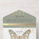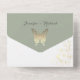Cet hôtel tout en un d'inspiration vintage vous accueille avec élégance dans un cadre Invitation qui comprend un papillon doré délicat, des détails de dentelle fleurie et un arrière - plan vert sage et doux. Le design plié comprend une carte postale RSVP intégrée et une salle supplémentaire pour l'information sur le site Web et l'événement—aucune enveloppe n'est requise. Parfait pour les mariages rustiques-chic, les mariages de jardin ou les mariages de printemps fantaisistes. Entièrement personnalisable avec les détails et les couleurs de votre mariage. Remarque : Cette invitation tout-en-un nécessite une enveloppe distincte pour l'envoi. Nous vous recommandons de l'apparier avec une enveloppe A9 standard (5,75 po x 8,75 po) pour un meilleur ajustement.