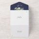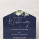 Le tout dans un faire-part de mariage bleu marine avec verdure botanique, feuilles rustiques et typographie élégante. L'invitation comprend une carte RSVP perforée avec votre code QR du site Web mariage et des détails. Conçu par Thisisnotme©