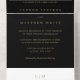 Un modèle tout-en-un unique avec carte rsvp pour une option pratique et économique pour les couples économes en budget. L'invitation moderne mais élégante en noir et or présente votre monogramme à deux lettres en haut et les détails de votre événement en or sur un arrière - plan noir. Un design chic et design qui conviendra à un couple minimaliste.