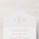 Mariage élégant tout en une invitation avec un thème botanique simple avec votre monogramme de part et d'autre de la flèche dessinée à la main de feuilles.