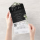 Faire-part de mariage tout-en-un noir et blanc avec de jolies lampes à cordes, une végétation fleurie et une typographie élégante. L'invitation comprend une carte RSVP perforée avec votre code QR du site Web mariage et des détails. Conçu par Thisisnotme©