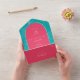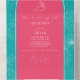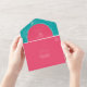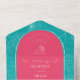 Illustration d'art en ligne blanche d'un motif feuille de palme sur un arrière - plan bleu avec texte blanc et design de coquillages sur arche rose avec bordure blanche. A l'extérieur est rose avec l'adresse de retour et l'illustration en feuille de palme sur le rabat. Rsvp propose du code qr et un format traditionnel.