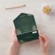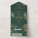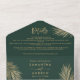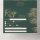 Moderne chic mariage tropical palmier d'or tout en une invitation sur éditable vert émeraude, avec détails invitation principal et rsvp, avec feuille de palmier de feuille d'or et élégant script.