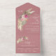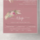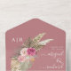 Pampas séché herbe et palmiers feuilles poussiéreux rose rose boho tout en un faire-part de mariage. Un joli design floral pour votre mariage qui présente des bouquets d'herbe de pampas séchée, des palmiers feuilles et roses, les initiales du couple et les noms en typographie script sur arrière - plan rose poussiéreux.