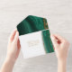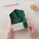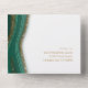 Cet ensemble de design mariage, avec son motif abstrait d'ondulations fluides et de veines d'or scintillant, rappelle les formations rocheuses et les gemmes étincelantes. La palette de couleurs à bijoux dans les tons vert émeraude ajoute à l'attrait. L'invitation combinée et la RSVP montrées ici a tout ce qui précède avec un agencement qui le fait ressortir de la foule. Ajoutez facilement les détails de votre événement en utilisant le modèle fourni. Recherchez ID903 pour voir d'autres choix de couleurs et coordonner des pièces pour cette collection de mariages unique.