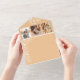 Faire-part de mariage tout-en-un à fleurs de pêche élégante avec code QR RSVP, photo personnalisable et monogramme. Conception écologique combinant plusieurs éléments dans un format pratique. Parfait pour les couples modernes à la recherche de style et de simplicité.