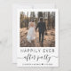 Élégant aménagement ou petit faire-part mariage et invitation à la réception de mariage tout-en-un. Le devant présente votre photo, "Happily Ever After Party" en simple typographie et un script chic avec des swashes et vos prénoms et date de mariage ou de réception réunis par un coeur. Au verso, personnalisez vos détails, entrez votre adresse de site Web mariage pour créer un code QR que les invités peuvent scanner pour voir vos photos mariages, tous les détails et à RSVP en ligne, et ajoutez vos noms dans un script signature.