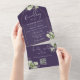 Tout en un violet reporté faire-part de mariage avec des feuilles botaniques verdoyants rustiques tombant sur une arche d'or renfermant une élégante typographie. L'invitation comprend une carte RSVP perforée avec votre code QR du site Web mariage. Conçu par Thisisnotme©