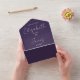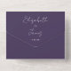 Cette faire-part de mariage minimaliste tout-en-un présente une typographie élégante sur un arrière - plan violet. L'invitation comprend une carte RSVP perforée avec votre code QR du site Web mariage. Conçu par Thisisnotme©