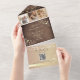 Donnez le ton de votre journée spéciale avec cette faire-part de mariage tout-en-un en bois rustique, alliant magnifiquement romantisme et commodité moderne. Doté de lampes à cordes brillantes, d'élégants accents floraux dorés et d'une section RSVP intégrée avec un code QR scannable, ce design offre à la fois charme et fonctionnalité. Customisez avec vos détails mariages, incluez un site Web mariage et présentez votre histoire d'amour avec des photos de couple personnalisées. Idéal pour les mariages d'automne, de boho, de campagne ou de grange, cette invitation capte la chaleur et l'intimité de votre célébration tout en gardant les choses organisées sans effort. Remarque : Cette invitation tout-en-un nécessite une enveloppe distincte pour l'envoi. Nous vous recommandons de l'apparier avec une enveloppe A9 standard (5,75 po x 8,75 po) pour un meilleur ajustement.