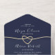 Faire-part de mariage tout-en-un en or et bleu marine élégante avec un design moderne de coeur de corde avec code QR pour RSVP et détails du site Web mariage. Une invitation parfaite pour sceller et envoyer - aucune enveloppe n'est requise. Customisez avec vos noms, votre date de mariage et votre adresse pour une option de papeterie mariage élégante et pratique. Un choix chic pour les mariages de marine et d'or modernes, formels et intemporels.