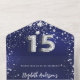 Arrière - plan bleu marine, décoré d'étoiles. La couleur bleue est inégale. Personnalisez et ajoutez des noms, des détails de parti, la date RSVP, l'adresse et le nom de retour. Le numéro 15 est écrit avec une police de style ballon.