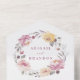 Eau romantique florale en mauve, rose poussiéreux, corail et jaune, avec script moderne tendance, élégant et romantique, idéal pour mariage moderne, mariage romantique, mariage de jardin botanique au printemps, été et automne. Voir toutes les pièces correspondantes dans la collection.