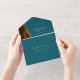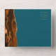 Le bord gauche de cette élégante faire-part de mariage tout-en-un moderne et RSVP est doté d'une bordure d'aquarelle couleur orange brûlée et rouille ornée d'une parties scintillant en faux or. La carte RSVP détachable offre de l'espace pour que les clients puissent commencer leur choix de trois entrées. Le texte personnalisable combine écriture manuscrite dorée, cuivre et polices italiques sur un arrière - plan bleu turquoise. L'adresse de retour apparaît sur le rabat extérieur et sur le côté arrière du RSVP.